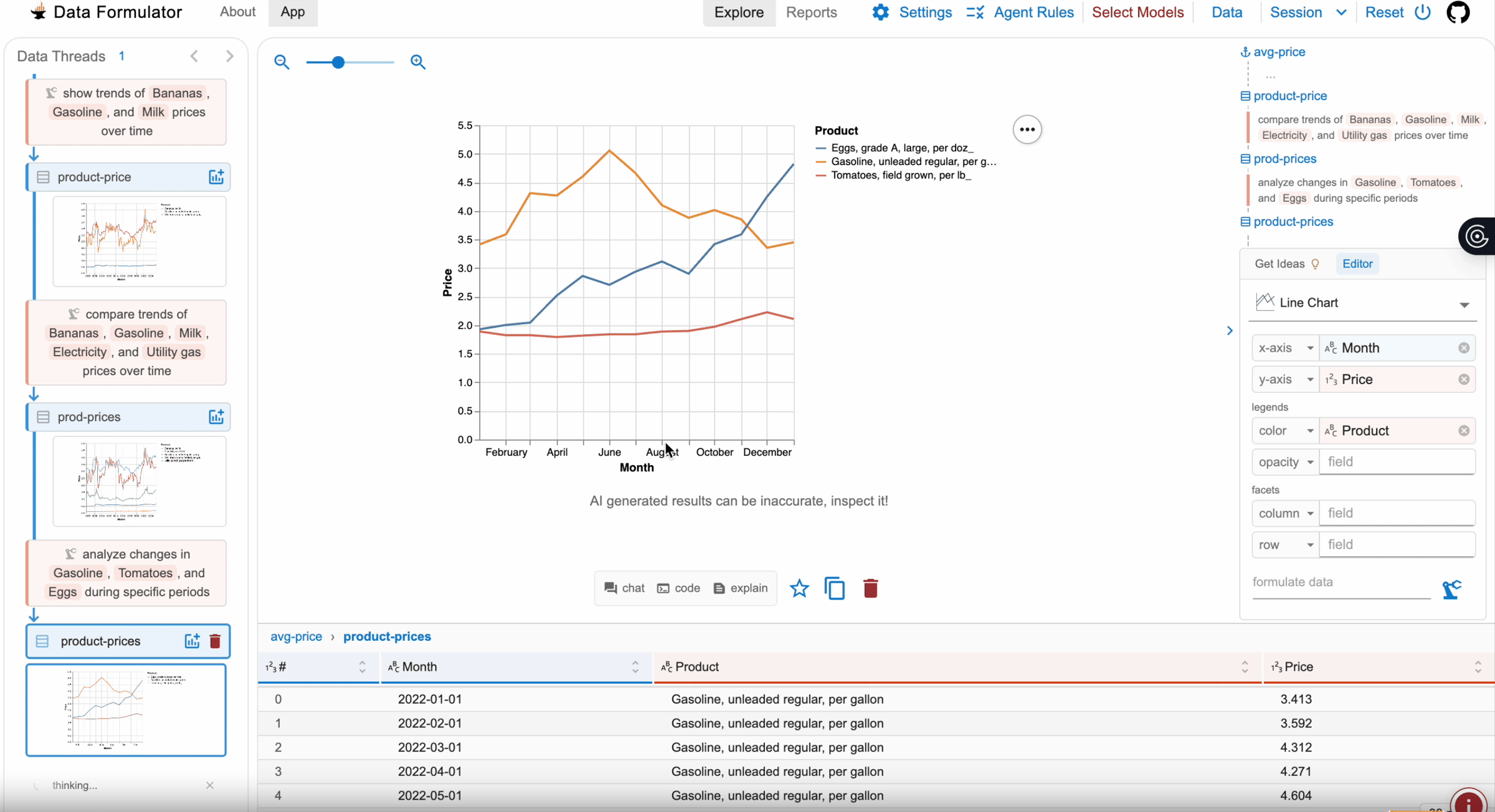 There’s also an agent mode that can help surface ideas from the data. Give it a broad prompt like “show me interesting trends in this dataset”, and it will start transforming the data, generating visualizations, and suggesting directions you can explore further.