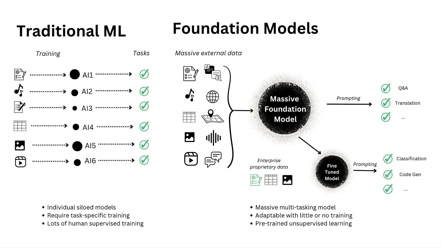 Unlike traditional ML models that are custom-built for specific tasks, foundation models are trained on massive, varied datasets.