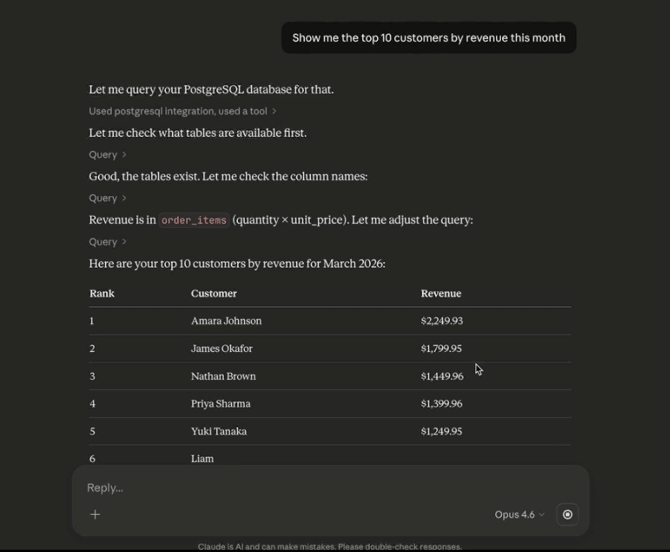 I installed Claude Desktop and connected my PostgreSQL database through MCP. Now, instead of opening a SQL client, writing a query, running it, copying the results, I can just ask: