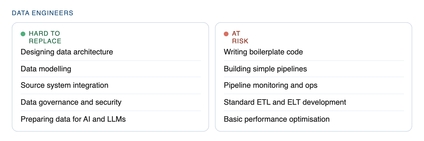 Detecting failures and triggering retries is well-structured work AI already handles in parts today. Data modelling and architecture are among the safest tasks in any data role - they require too much business context and long-term judgment for AI to own.
