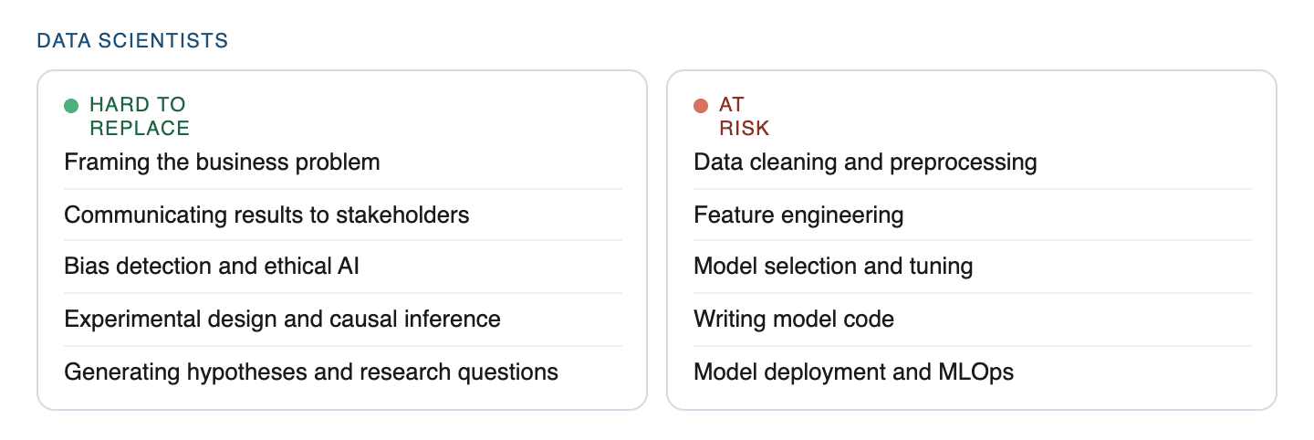 Framing the right business problem is the hardest thing to automate and also the most valuable thing a data scientist does. It requires domain knowledge, stakeholder trust, and strategic thinking AI simply does not have.